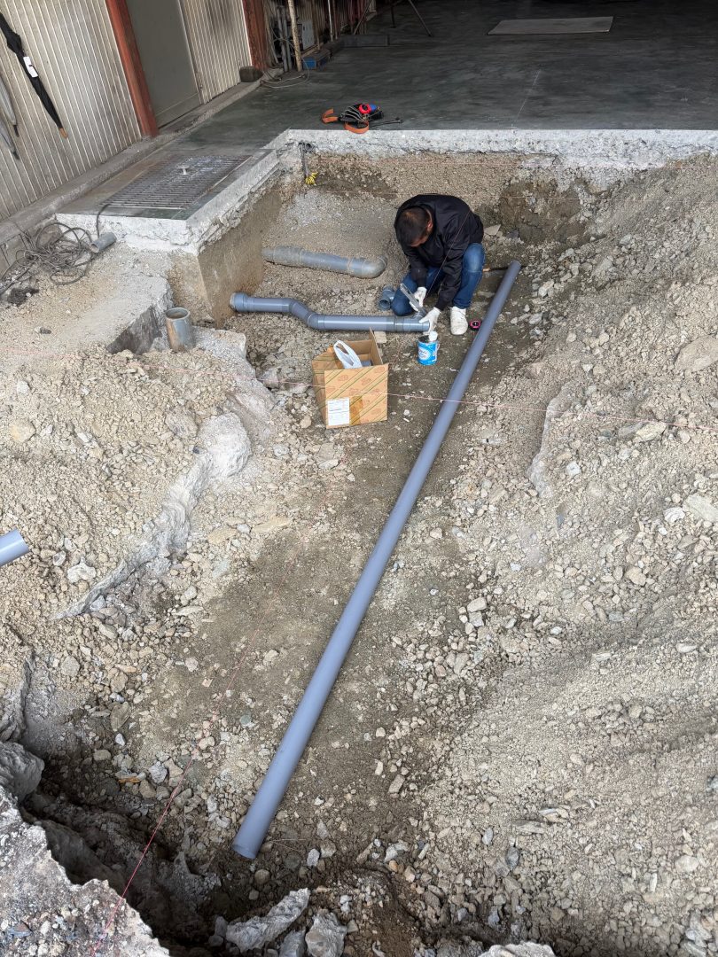 機械ピットの排水配管してから鉄筋組み立てました。