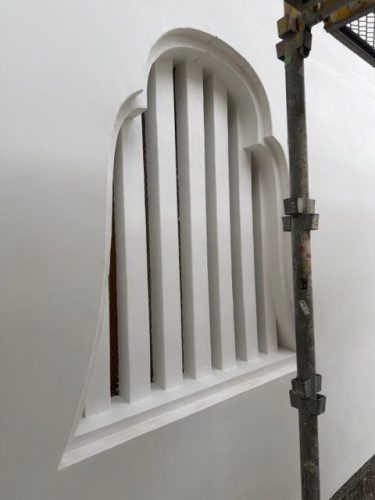 窓のダキ部分が養生のアクが出たので、足場解体後に補修します。