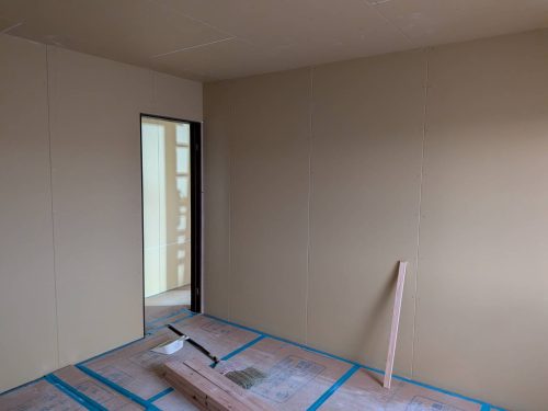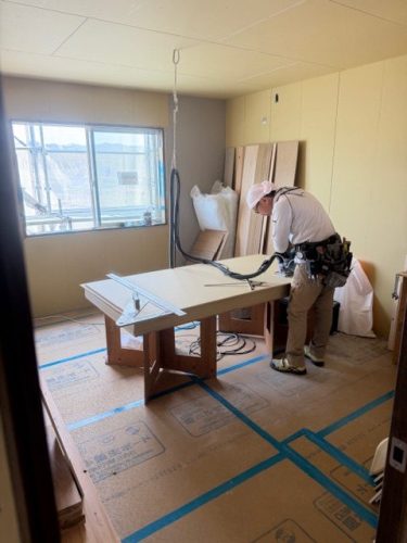 壁の石膏ボード貼っていってます。